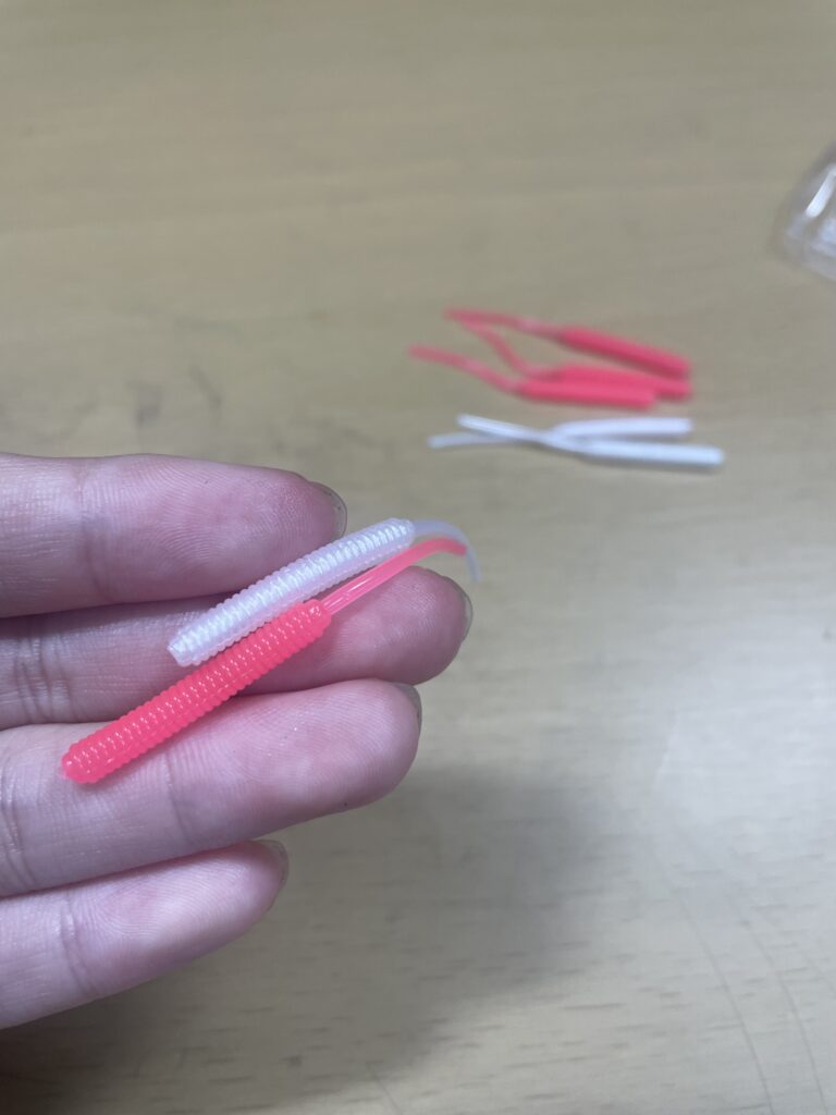 - ダイソー ワーム ストレート: 細長く、フォール(沈むとき)の姿勢が安定しているのが特徴です。色はピンクやグロー(夜光)系を選びました。